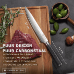 Het lemmet is vervaardigd uit hoogwaardig Duits carbonstaal, gehard met vloeibare stikstof voor langdurige scherpte, slijtvastheid en weerstand tegen roest. Subtiele Damascus-patronen geven het mes een luxe uitstraling.