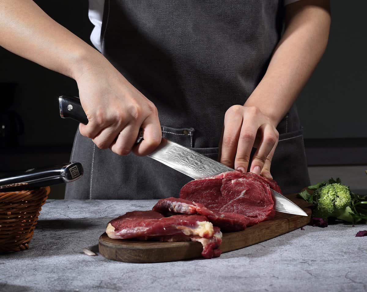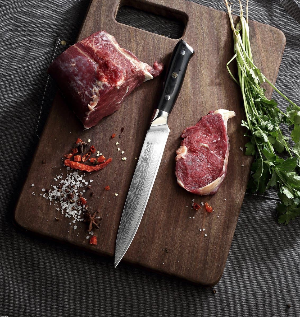 Dompel jezelf onder in de wereld van culinaire perfectie met dit Premium Cloud Premium C5 Vleesmes. Dit vleesmes met zijn 20 cm lange lemmet en gemaakt van 67 lagen echt Japans Damaststaal, is een onmisbaar stuk gereedschap voor elke serieuze kok. Het vleesmes is niet alleen vlijmscherp, maar ook een wonder van design en techniek met zijn bijzondere smeedpatroon en ergonomisch handvat.