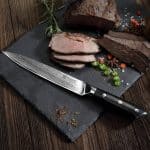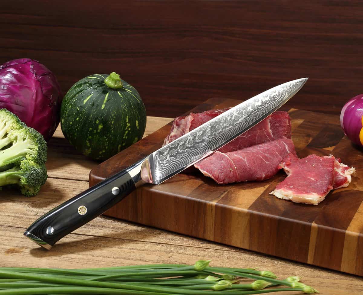 Het C5 Vleesmes is vervaardigd uit gesmeed damaststaal. Tussen de 32 lagen damaststaal per zijde bevindt zich een kern van VG-10, waarmee je daadwerkelijk snijdt. Dit staal is erg hard en kan vlijmscherp geslepen worden wanneer dit nodig is.