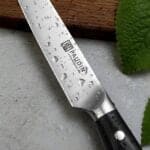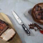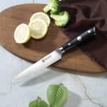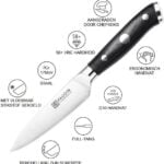 Ervaar het genot van koken en tafelen met het Paudin Ultra Dark Premium D6 Officemes. Dit vlijmscherpe keukenmes, gemaakt van HRC 58+ hoogwaardig roestvast carbonstaal, is een onmisbaar hulpmiddel in je keuken. Het mes is voorzien van een ergonomisch handvat van premium G10, waardoor het comfortabel en veilig werken is. Met een lemmetlengte van 12,5 cm is het Paudin mes perfect voor precisiesnijwerk en alle andere snijklussen.