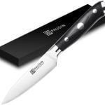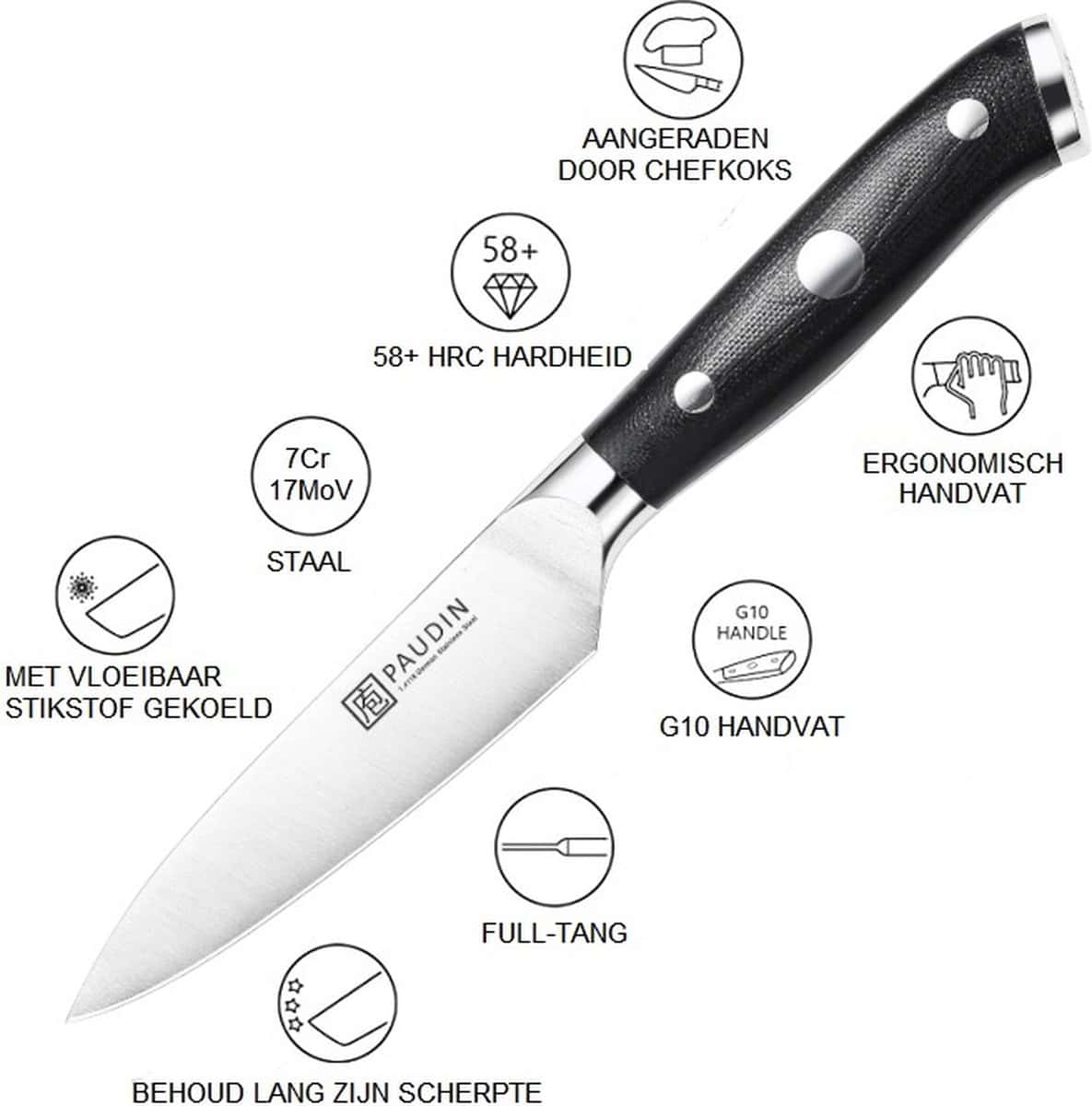Ervaar de superieure kracht en precisie van het Paudin Ultra Dark Premium D7 Groentemes. Dit keukenmes, met een lengte van 9 cm, is gemaakt van HRC 58+ hoogwaardig roestvast carbonstaal. Het bezit een vlijmscherp mes voor nauwkeurig snijwerk. Het mes wordt perfect aangevuld met een ergonomisch handvat. Het is gemaakt van premium G10 voor een comfortabele en veilige grip tijdens het snijden.