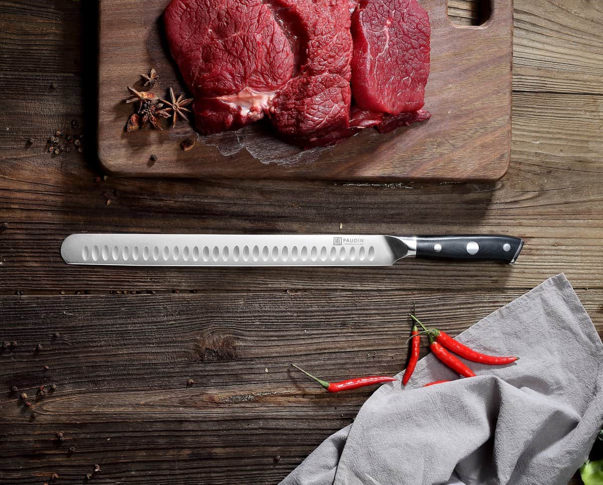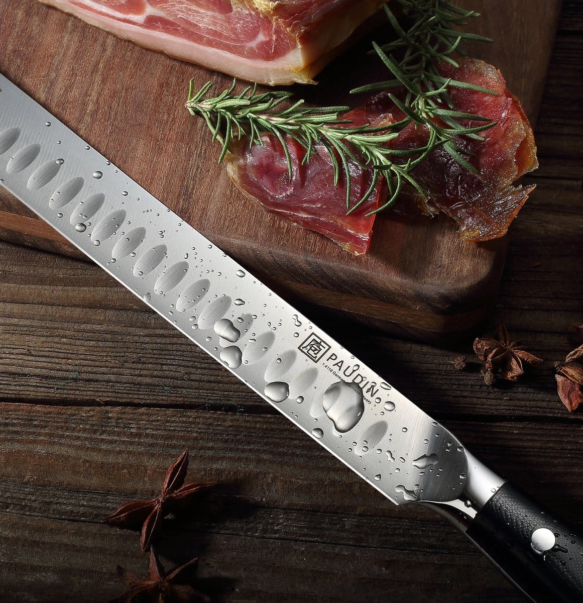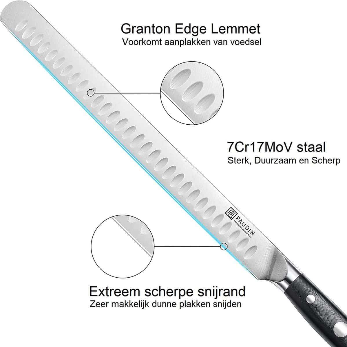 Het Paudin D8 Hammes is voorzien van een unieke Granton-rand om glijdende wrijving te verminderen. De holle delen in de rand zorgen ervoor dat de plakjes niet aan het mes blijven kleven, waardoor je met gemak zeer dunne plakjes vlees, vis en kazen kunt snijden. Het ergonomische handvat van superieur G10 glasvezel zorgt voor een comfortabele en stevige grip tijdens het gebruik van het Ultra Dark Premium D8 Trancheermes.