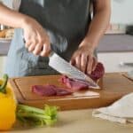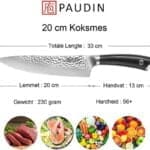 Het gebruikte roestvaste koolstofstaal van het PAUDIN Hammered Pro HP1 Koksmes heeft een zeer hoge hardheid van meer dan 56 Rockwell Scale of Hardness, part C (HRC). Het 20 centimeter lange mes wordt handmatig geslepen in een hoek van 14 tot 16 graden per zijde. Dit resulteert in een buitengewoon scherp eindresultaat.