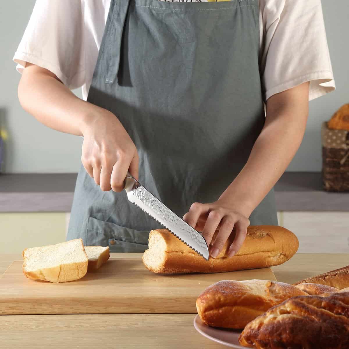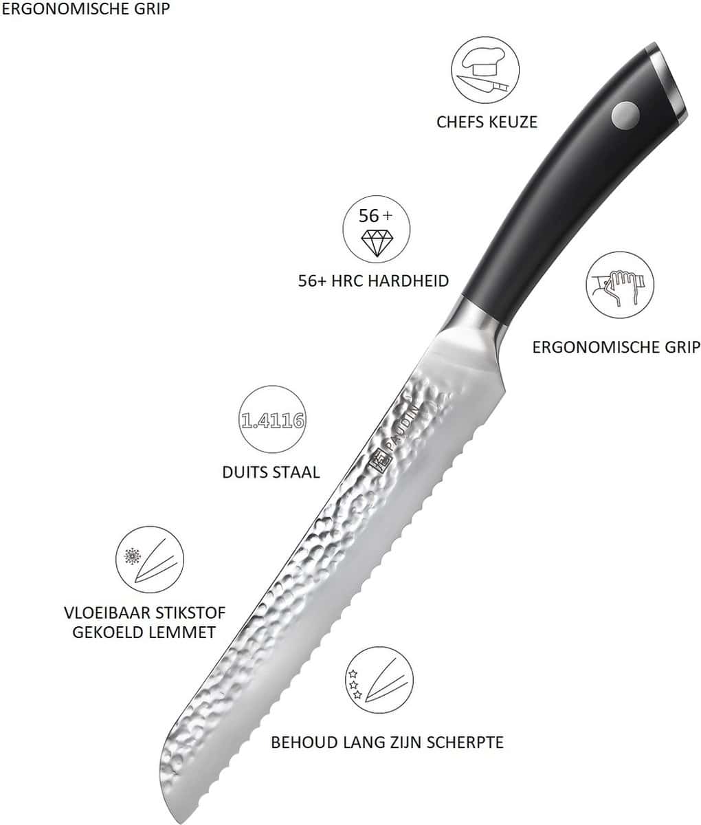 Het HP2 Broodmes is niet alleen uitstekend functioneel, maar ook prachtig ontworpen. Het unieke hamer patroon op het lemmet is een echte blikvanger in de keuken. Het hoogwaardig carbonstaal staat bekend staat om zijn uitmuntende treksterkte, hoge hardheid en goede slijtbestendigheid.