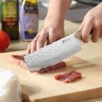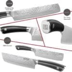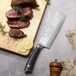 Het Hammered Pro HP4 Nakiri Mes is vervaardigd uit hoogwaardig koolstofstaal. Dit staal bevat naast een hoog koolstofpercentage ook molybdeen, vanadium, mangaan, siliconen en chroom. Deze samenstelling zorgt voor uitmuntende treksterkte, hoge hardheid en een goede slijtbestendigheid. Het mes is goed roestvast dankzij het hoge chroomgehalte en de siliconen.