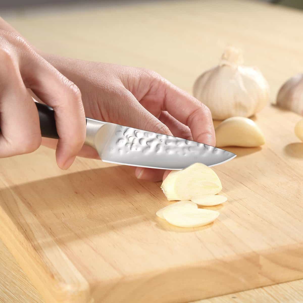 Ontdek het Hammered Pro HP6 Groentemes, met een lemmet van 9 cm, uit de Hammered Premium serie. Vervaardigd uit hoogwaardig roestvast Koolstofstaal en met een uniek hamer patroon, is dit keukenmes niet alleen een blikvanger, maar ook een uiterst nuttige hulp in de keuken. Het perfecte cadeau tip voor zowel de professionele chef als de hobbykok!
