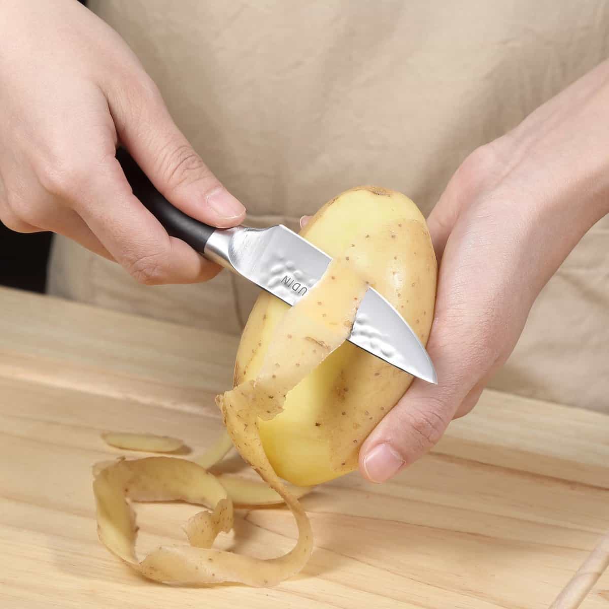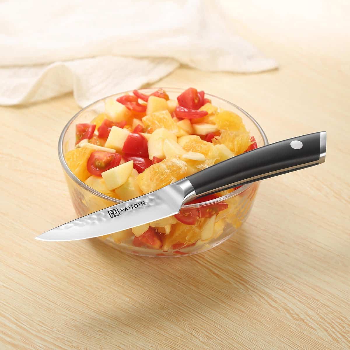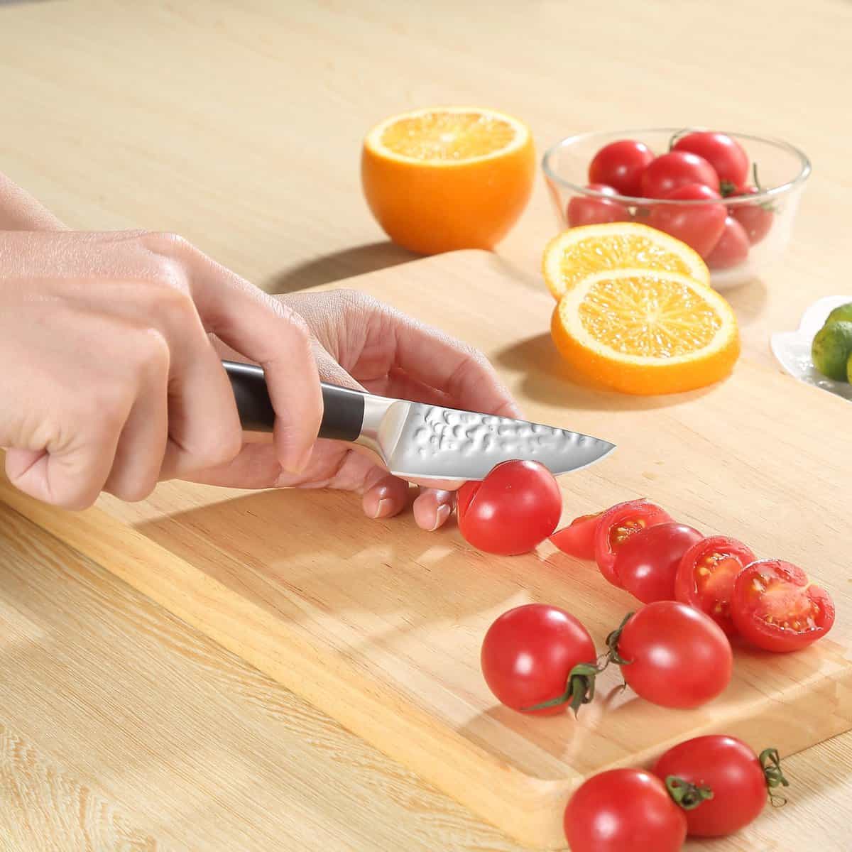 Vervaardigd uit hoogwaardig koolstofstaal (HRC 56+) en uitgevoerd met een ergonomisch handvat, perfect voor fijn snijwerk, schillen en het voorbereiden van kruiden.