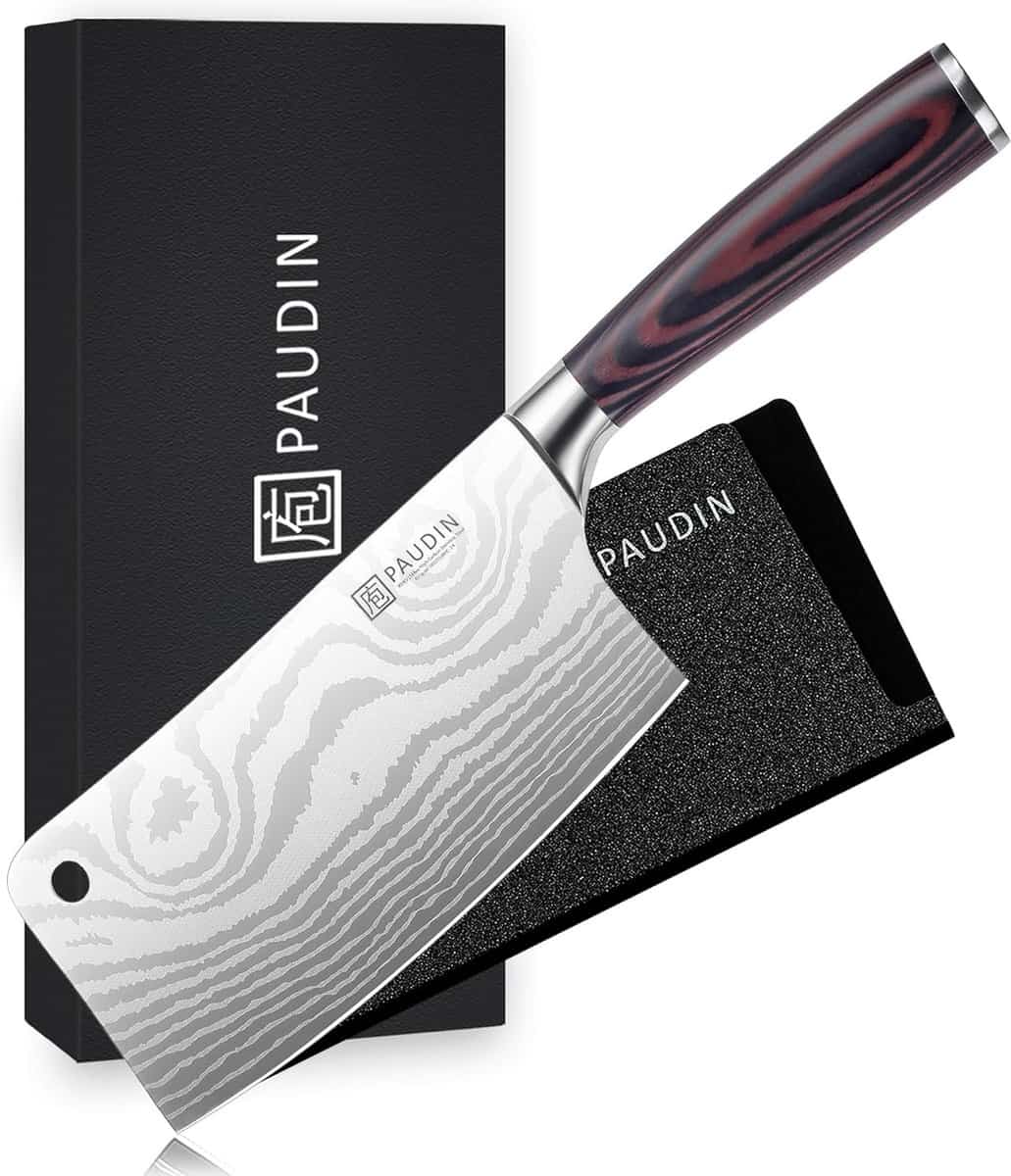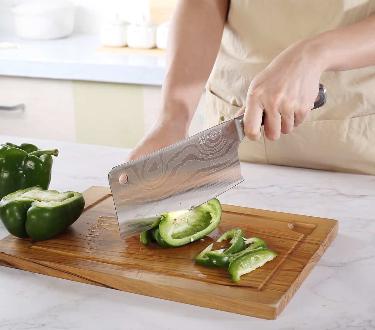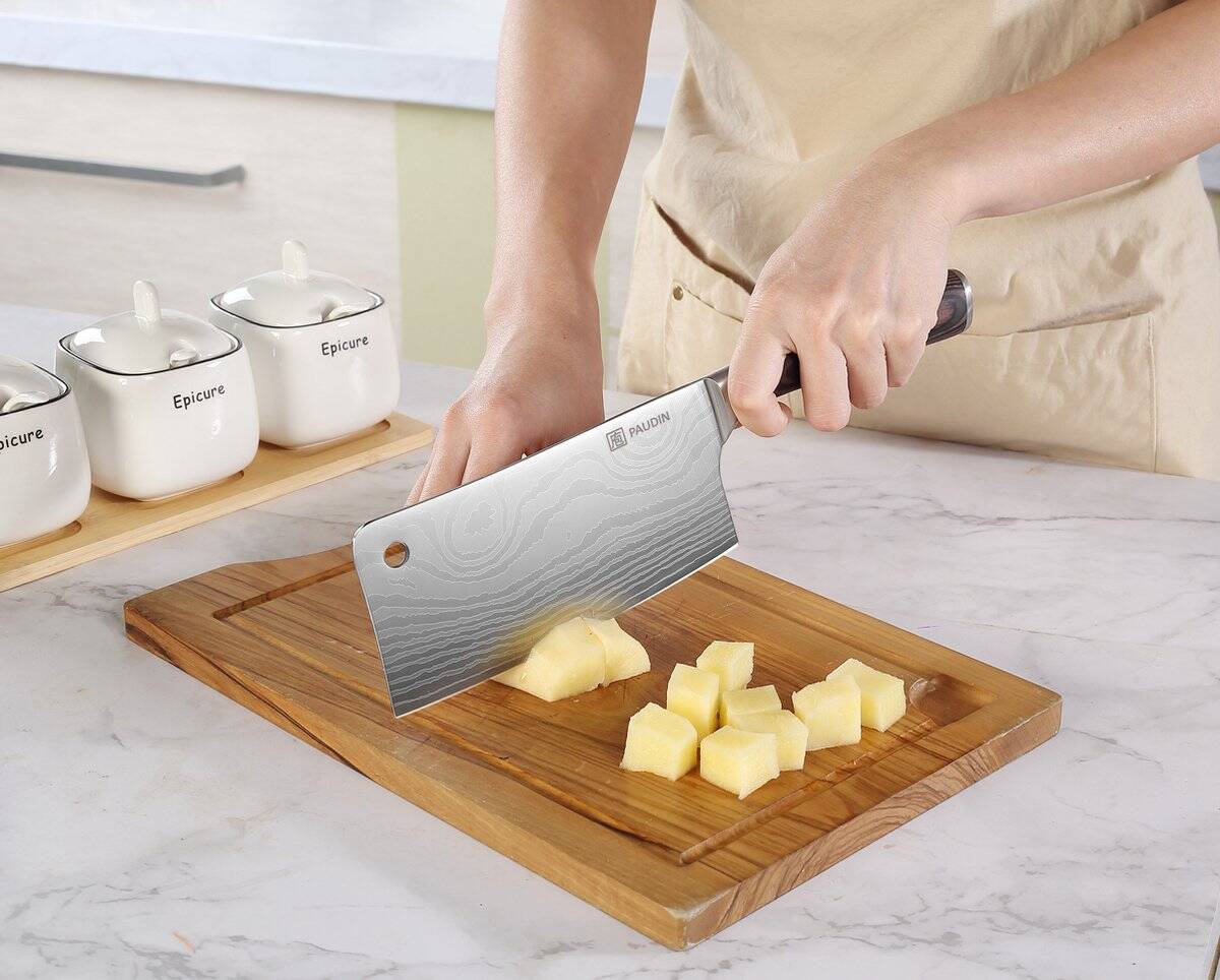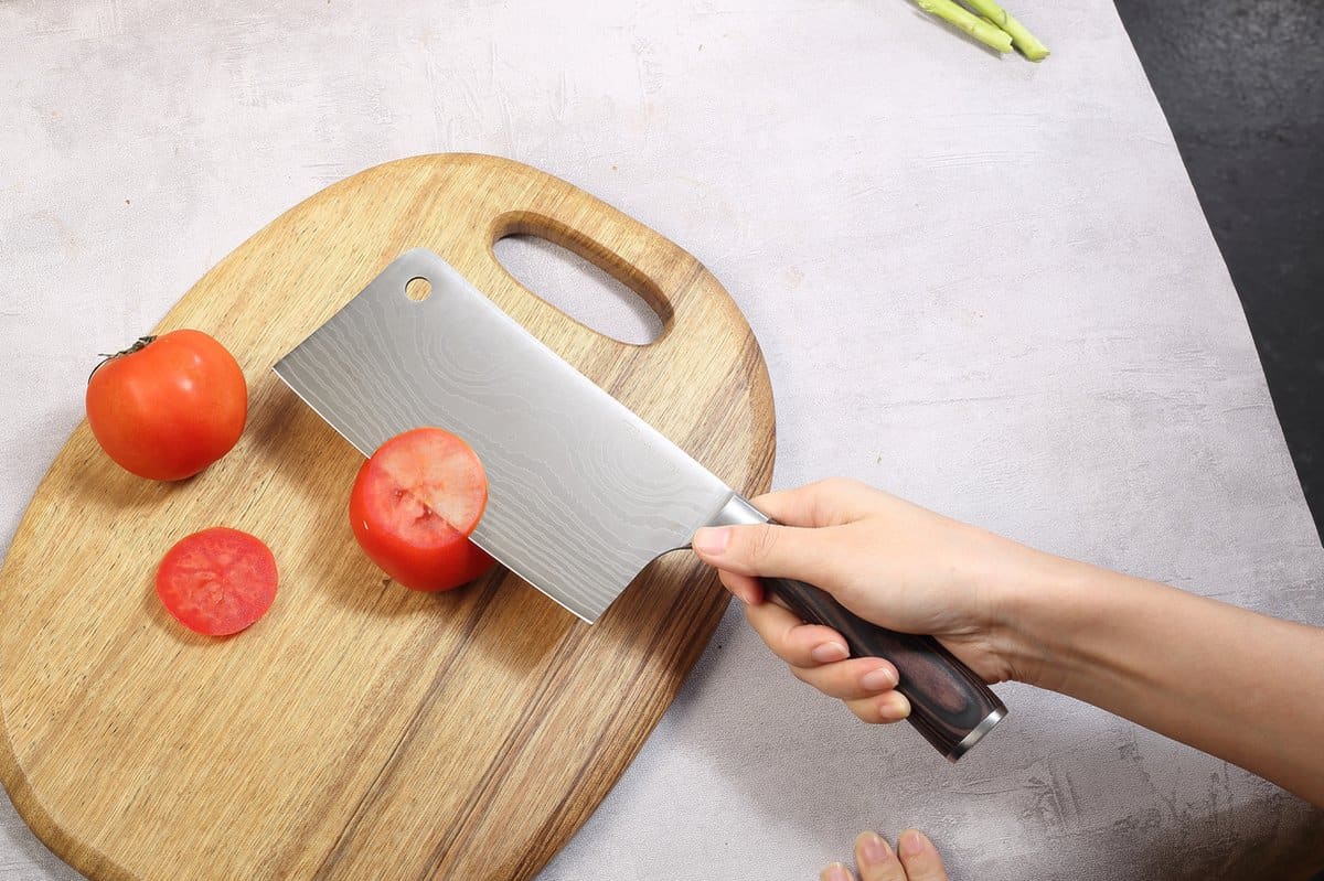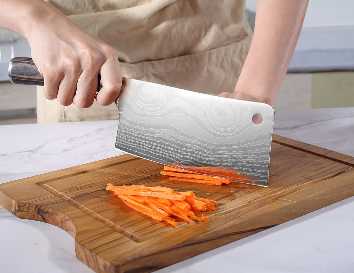 Het elegante damascus-patroon en het brede, rechthoekige lemmet maken dit Chinese koksmes ideaal voor krachtig snijden van harde groenten en fruit.