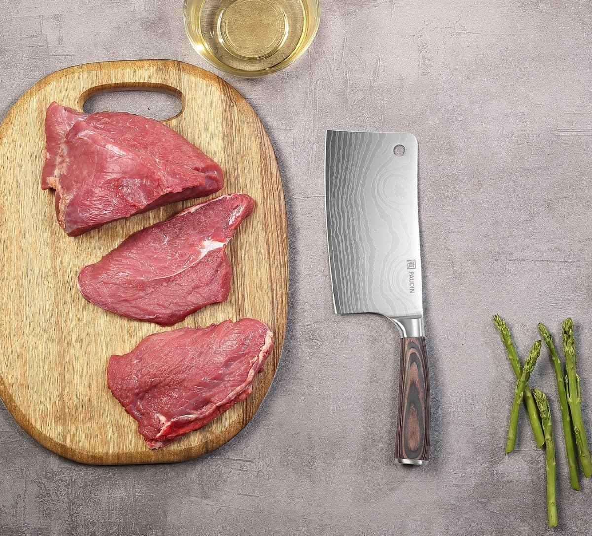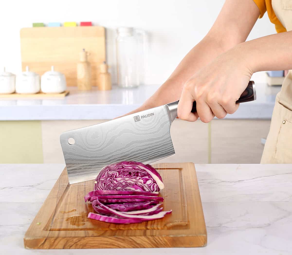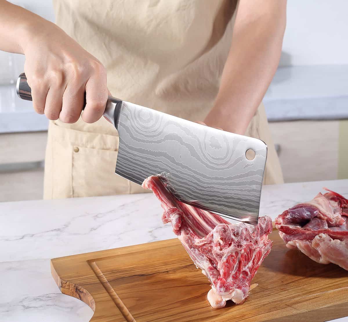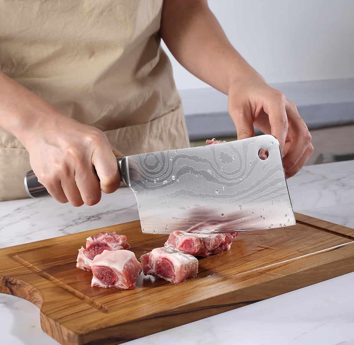 Het elegante damascus-patroon en het brede, rechthoekige lemmet maken dit Chinese koksmes ideaal voor krachtig snijden van harde groenten en fruit.