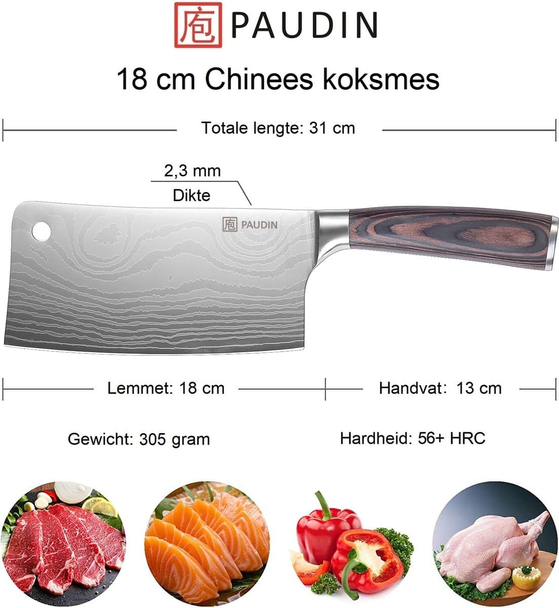 • Veelzijdig in gebruik, ideaal als BBQ mes en Chinees koksmes