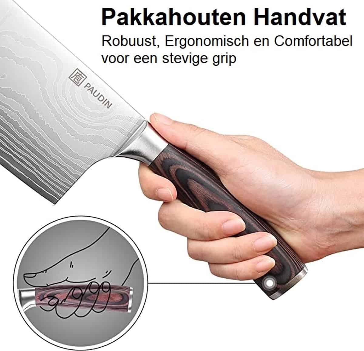 • Handvat: Ergonomisch en antislip handvat van luxe pakkahout