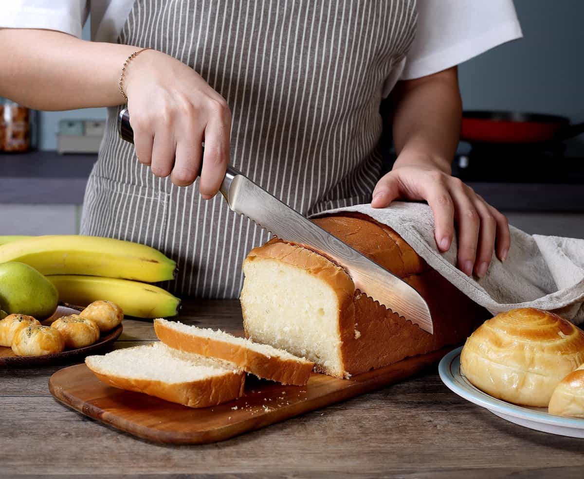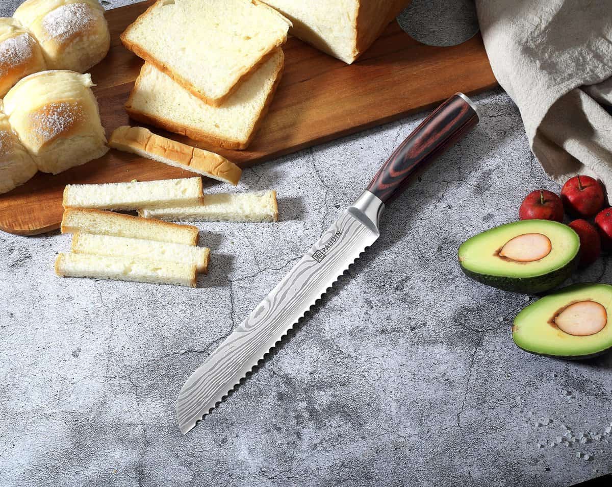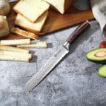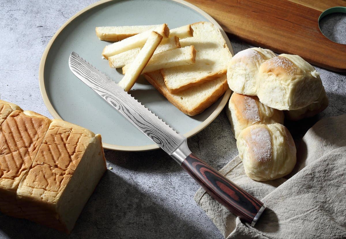 Het elegante damascus-patroon en het lange gekartelde lemmet zorgen voor moeiteloos snijden van zacht en hard brood zonder kruimels.