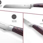 • Ergonomisch ontwerp: Het mes heeft een ergonomisch ontworpen, antislip handvat van luxe pakkahout, wat zorgt voor een comfortabele en veilige grip.