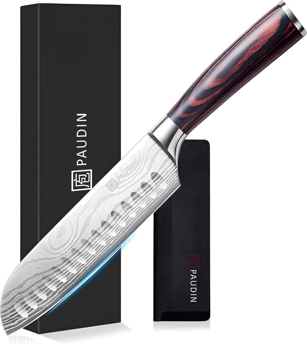 Het Paudin N5 Santoku Mes is vervaardigd uit koolstofstaal, tevens carbonstaal genoemd. Het is een kwalitatief hoogwaardig materiaal dat bekend staat om zijn uitmuntende treksterkte, hoge hardheid en goede slijtbestendigheid.