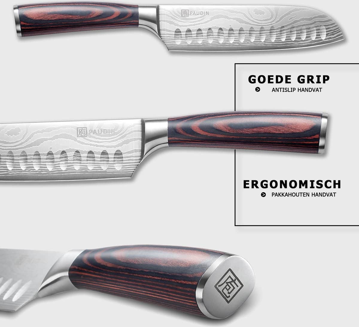 Ergonomisch handvat: Het ergonomische handvat van luxe pakkahout biedt een solide maar comfortabele grip. Dit maakt het mes gemakkelijk in gebruik en voorkomt vermoeidheid tijdens het snijden en past perfect bij het Universal N5 Santoku Mes.