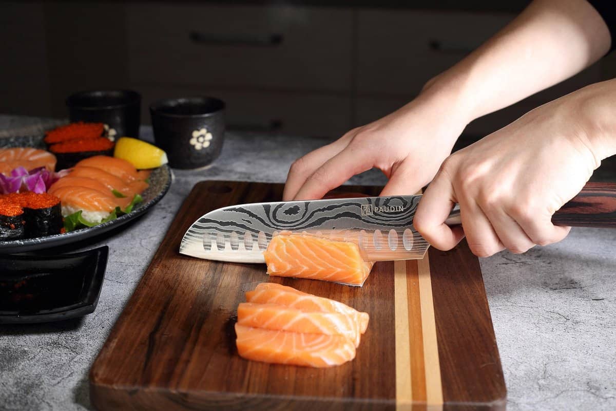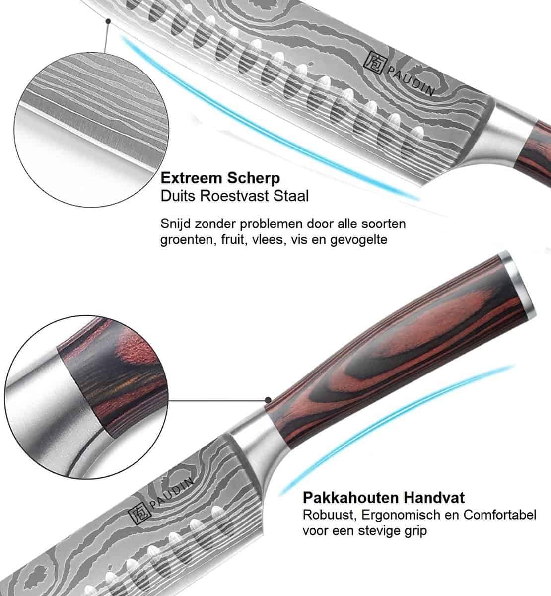 Premium santoku mes: Het santoku mes, dat ‘drie deugden’ betekent, is ontworpen om te voldoen aan de behoeften van diverse snijtaken in de keuken. Het is lichter en scherper dan een gewoon koksmes, waardoor het een uitstekende keuze is voor het snijden van vlees, vis en groenten.