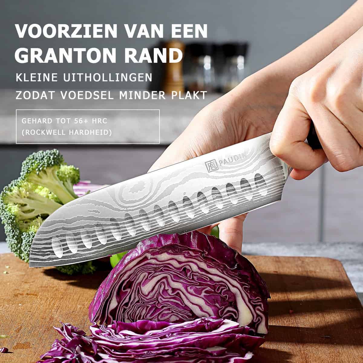 Ontdek de precisie en het gemak van het Paudin Universal N5 Santoku Mes. Het vlijmscherpe lemmet van 17,5 cm en het esthetisch ingelaserd Damascus patroon op hoogwaardig Carbonstaal maken dit N5 Santoku Mes niet alleen een functioneel, maar ook een prachtig keukenaccessoire. Tevens zorgt de Granton-rand voor kleine luchtzakjes tussen het vlees en het mes waardoor deze minder aan het lemmet plakt.