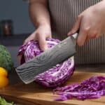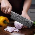 Met zijn prachtige ingelaserde damascus patroon op hoogwaardig carbonstaal en scherpe snede, is dit N6 Nakiri Mes niet alleen een functioneel keukeninstrument, maar ook een kunstwerk op zich. Perfect voor zowel professionele koks als enthousiaste thuiskoks die hun kookkunsten naar een hoger niveau willen tillen.