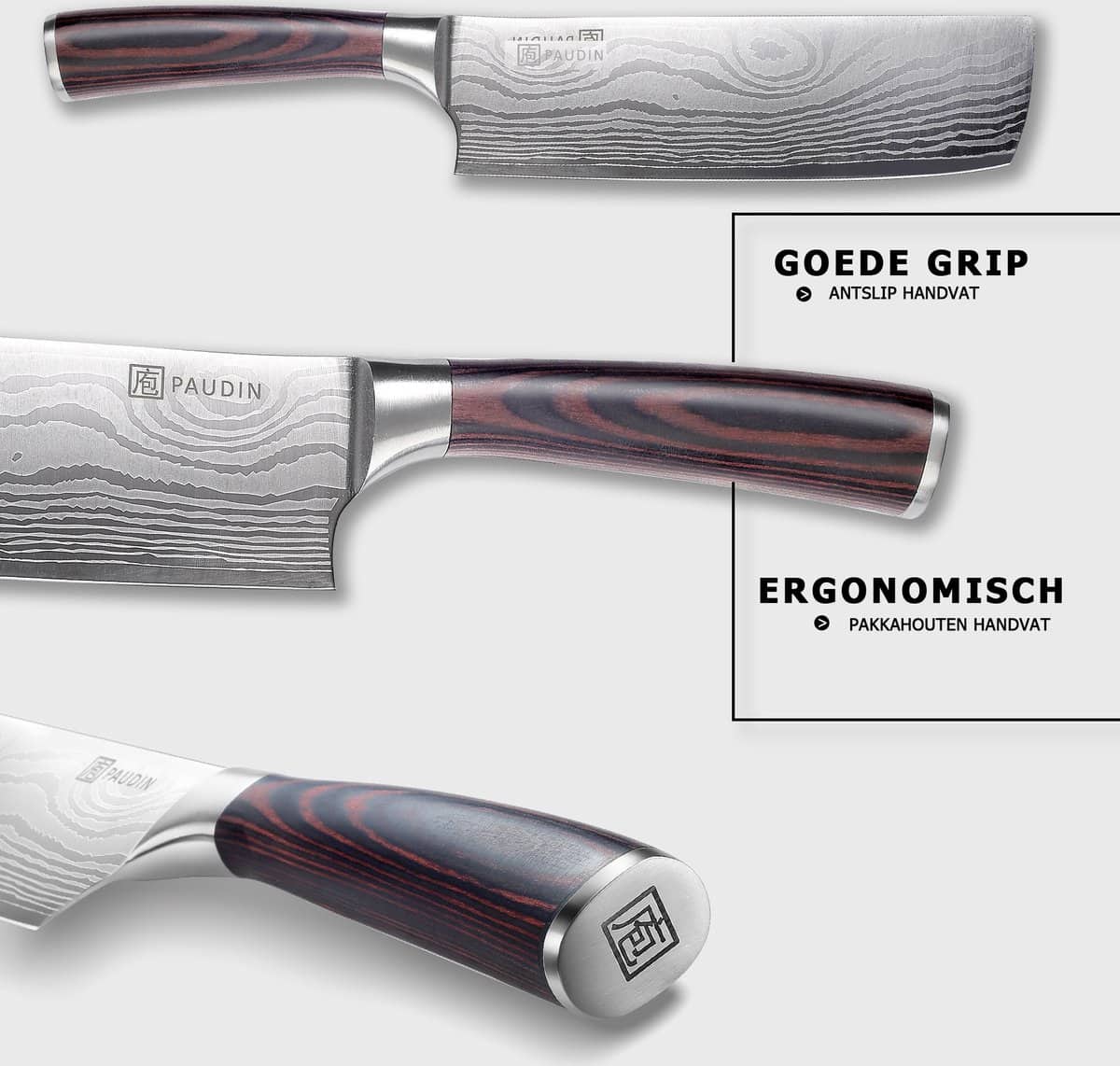 - Ergonomisch en antislip handvat van luxe pakkahout voor comfort en controle.