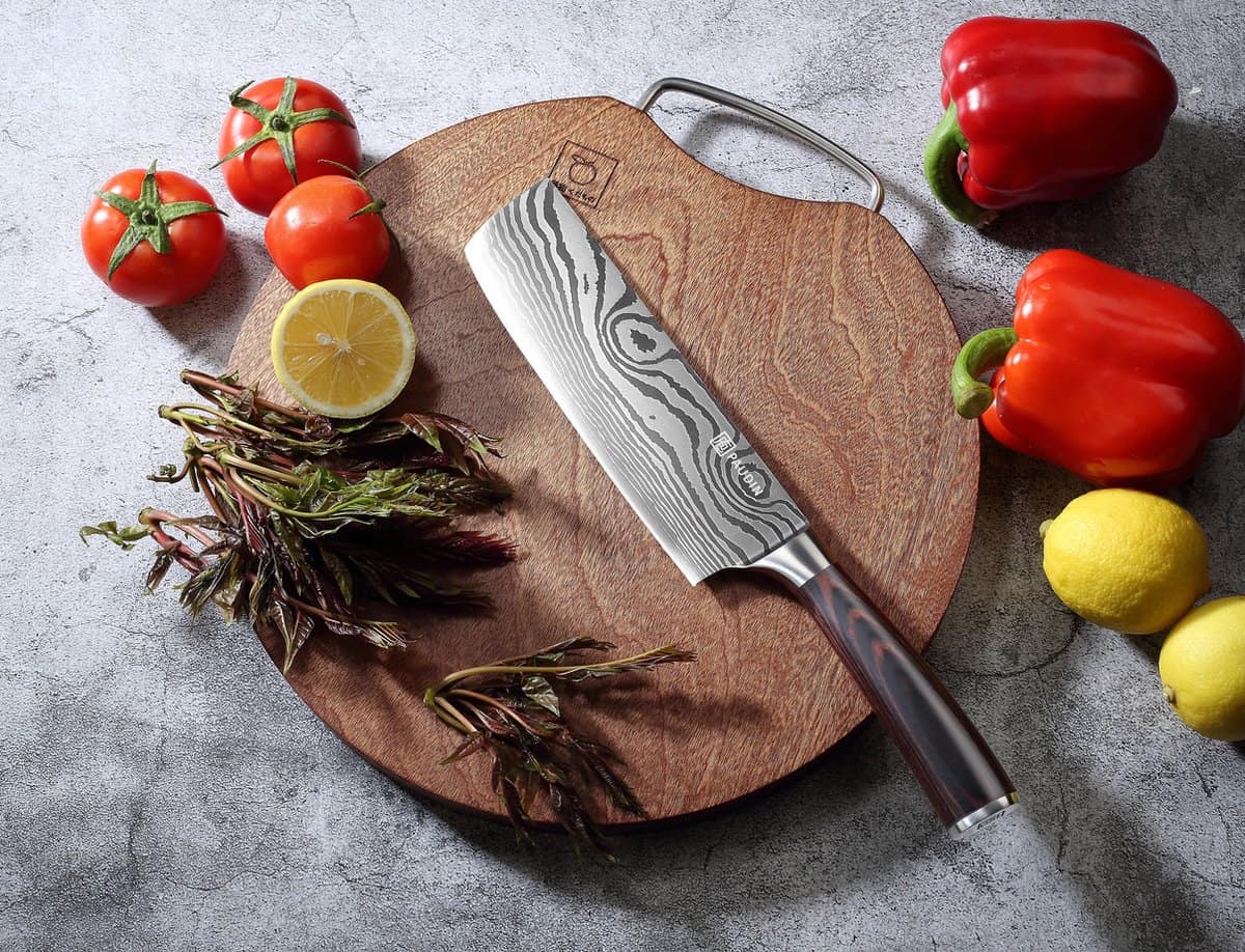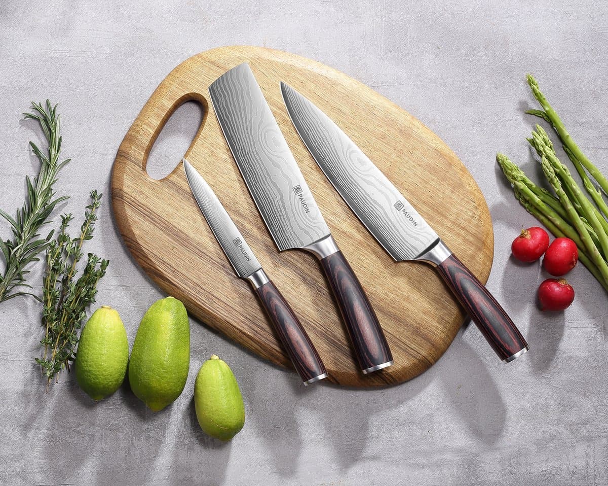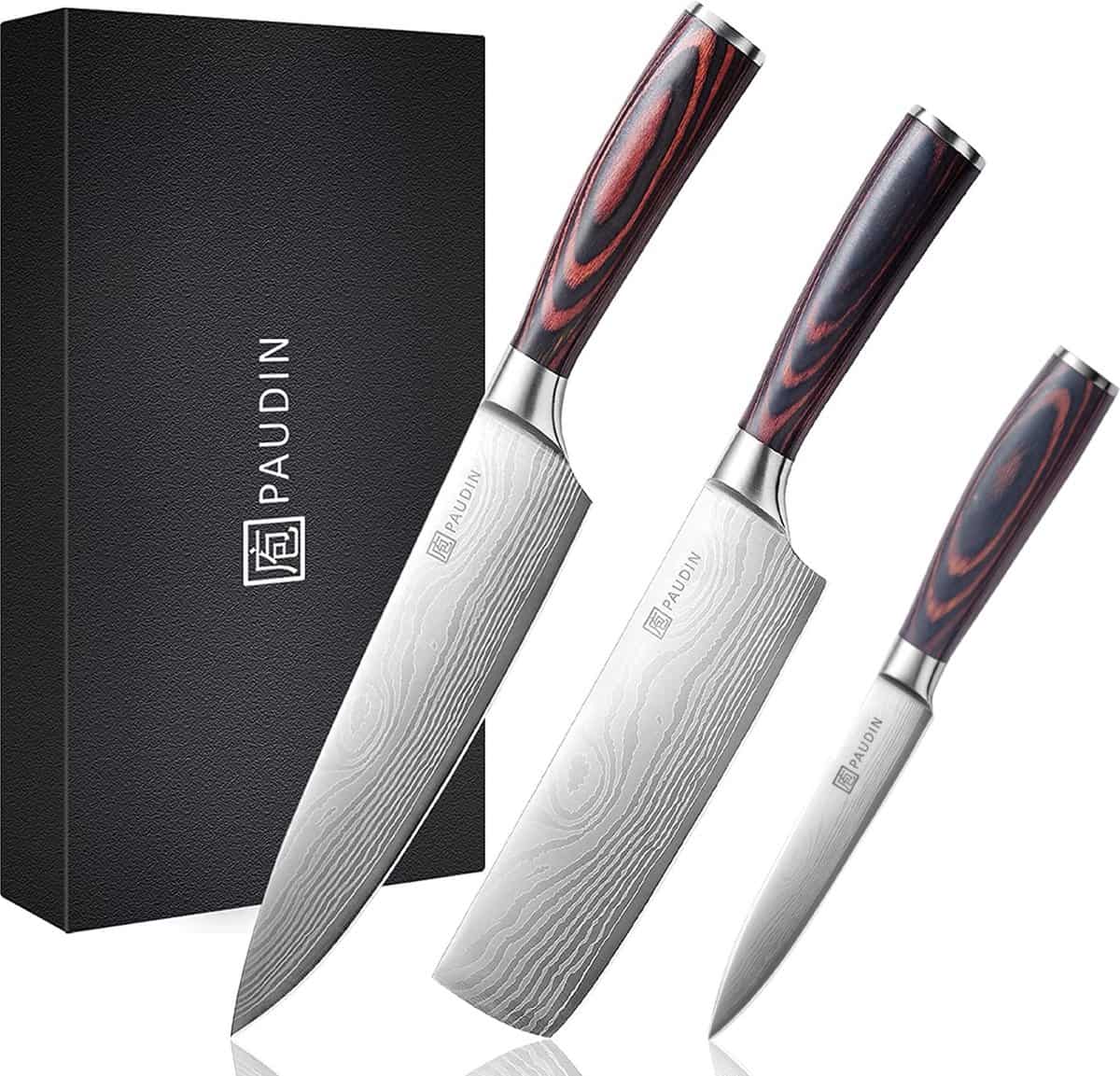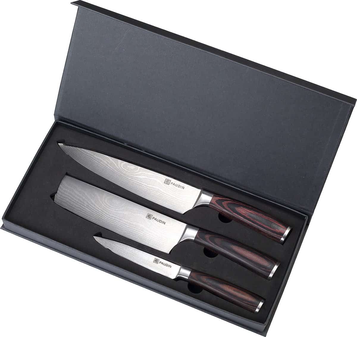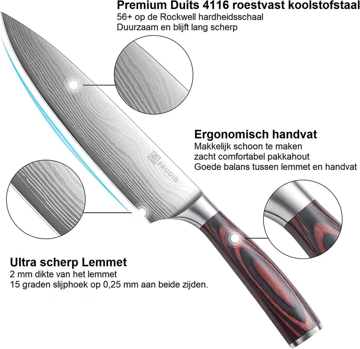 Ontdek de Paudin Universal NS1 Messenset, een parel onder de messensets dankzij zijn unieke combinatie van hoogwaardig carbonstaal en een esthetisch ingelaserd Damascus patroon.