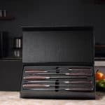 De Paudin NS7 Messenset bestaat uit het N1 koksmes, N4 broodmes, N5 Santoku mes, N6 Nakiri mes, N7 Officemes, N8 Schilmes en het N9 Vleesmes.