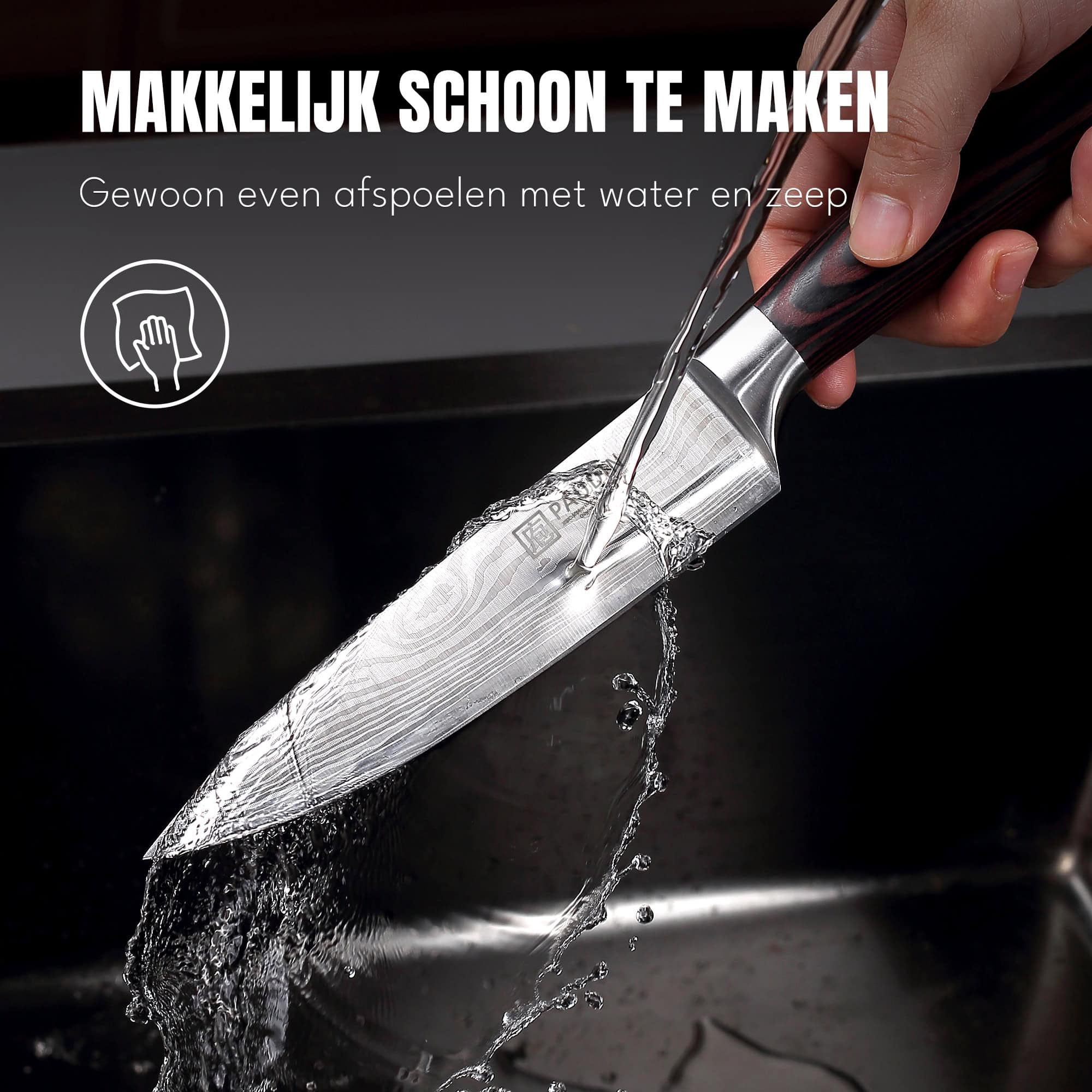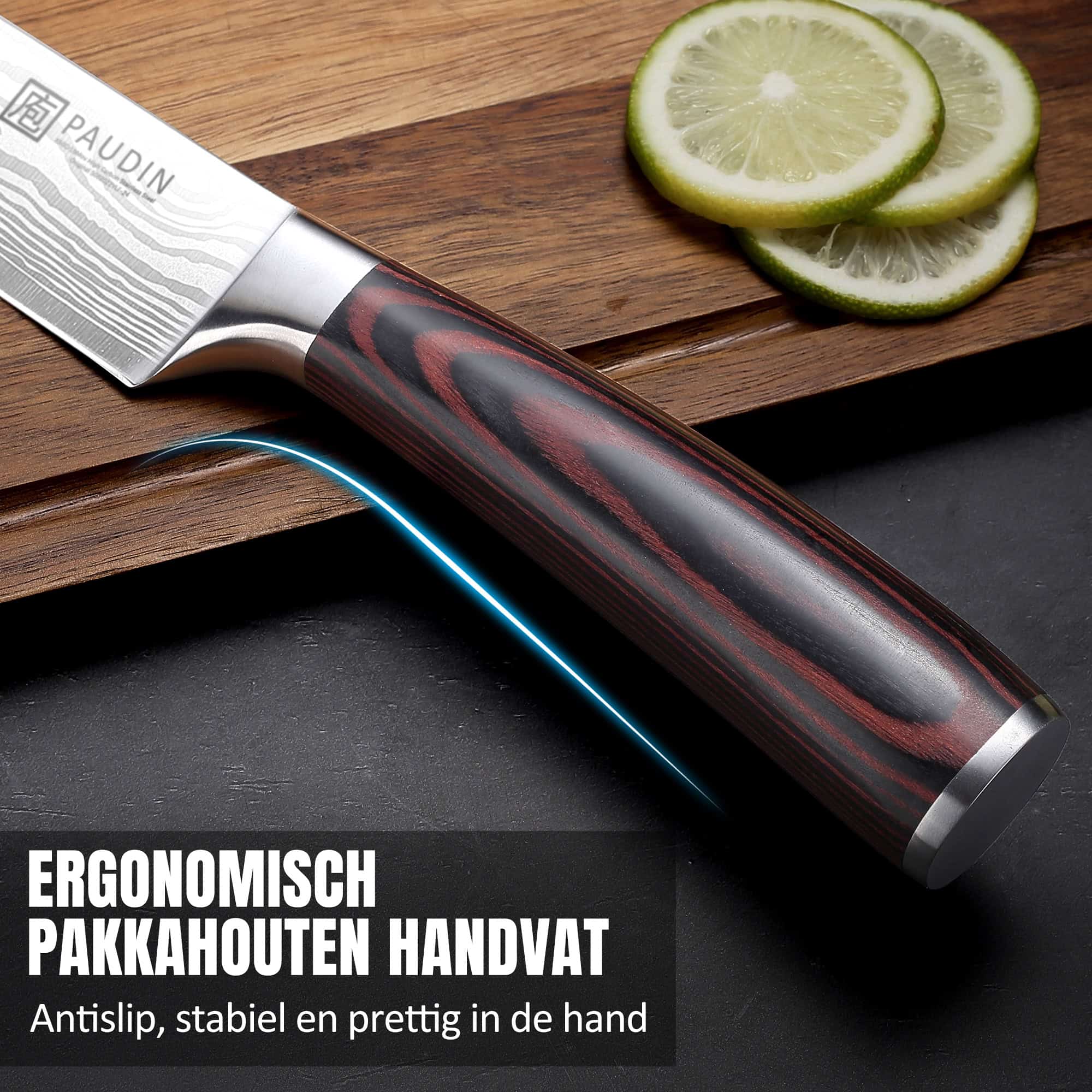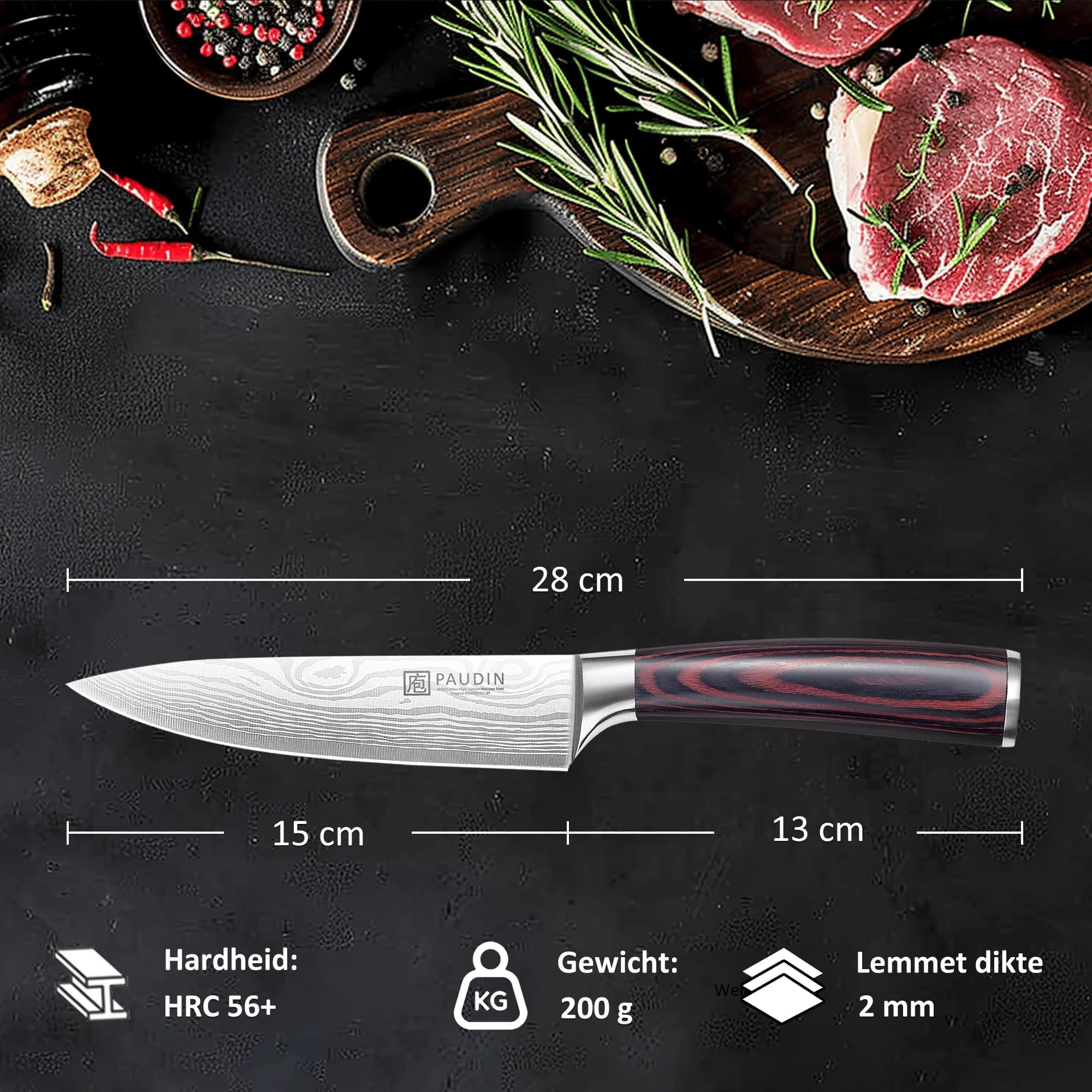 Het Universal N27 Koksmes is niet alleen functioneel, maar ook een lust voor het oog. Het gelaserde damascus patroon geeft het mes een luxe uitstraling, terwijl het ergonomische handvat zorgt voor een natuurlijke grip. Dit compacte koksmes is perfect uitgebalanceerd, waardoor je met gemak en precisie kunt werken, zelfs bij langdurig gebruik. Maak van elke maaltijd een meesterwerk met dit stijlvolle en krachtige keukenmes.