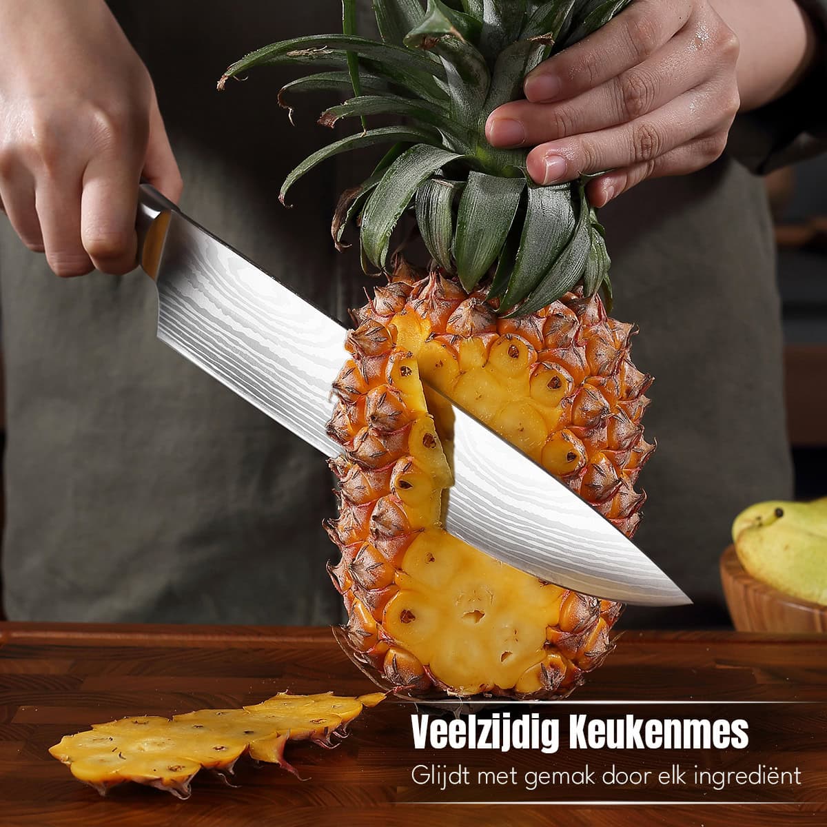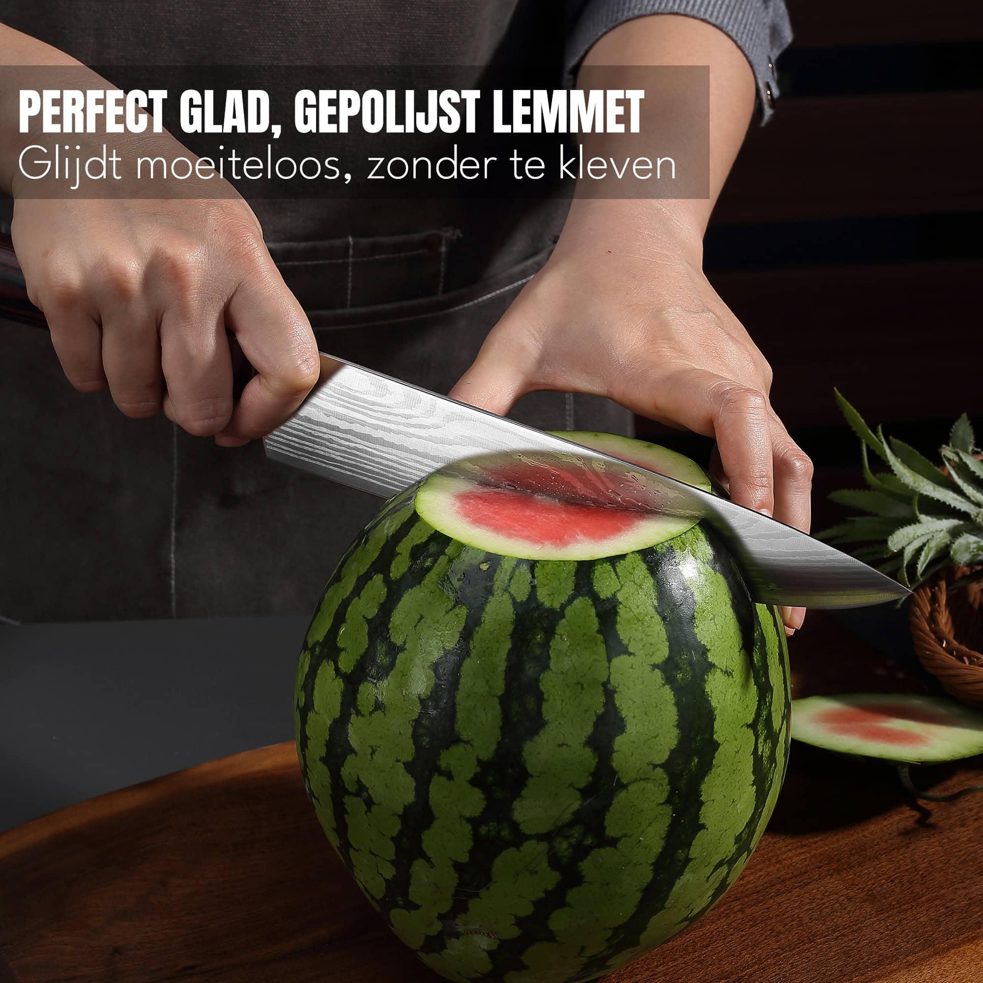 Dit extra grote koksmes is niet alleen functioneel, maar ook een lust voor het oog. Het verfijnde damascuspatroon geeft het mes een luxe uitstraling die elke keuken siert. Met zijn robuuste constructie en hoogwaardige afwerking is dit Universal N28 Koksmes ontworpen voor de veeleisende chef die alleen het beste wil. Het biedt niet alleen praktische voordelen, maar ook een gevoel van trots en luxe tijdens het koken.