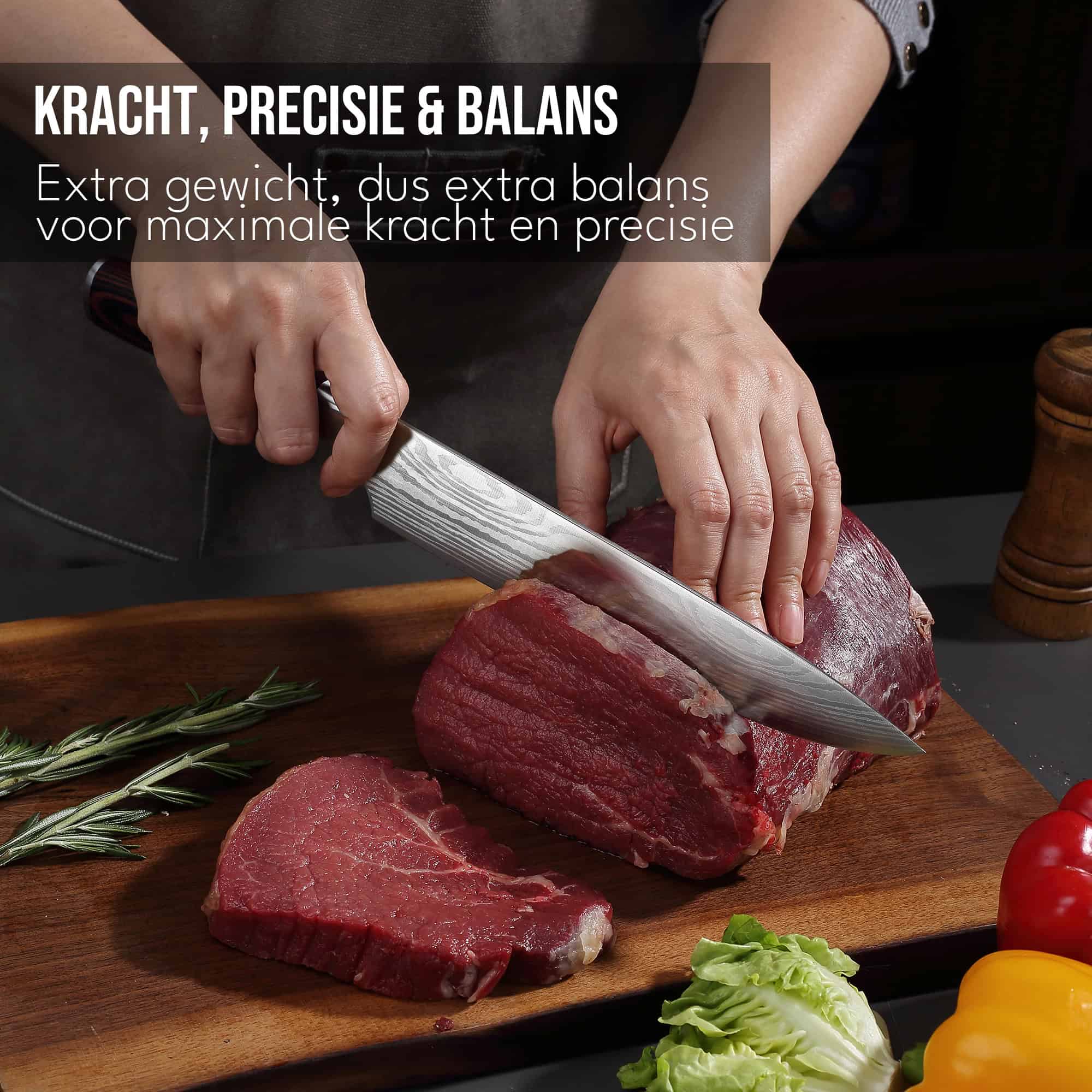 Vervaardigd uit cryogeen gehard koolstofstaal (HRC 56+) en voorzien van een ergonomische pakkahouten handgreep — ideaal voor het grote stukken vlees, extra stoer bij de BBQ!